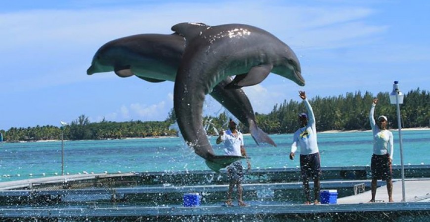 disfrutar el Arrastre Dorsal, en el que dos delfines te tiran a través del agua cristalina mientras te agarras a sus aletas dorsales.